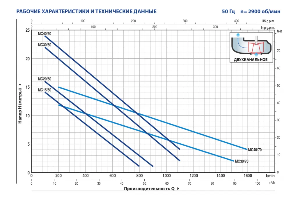 Графические характеристики фекального насоса PEDROLLO MC 30/50
