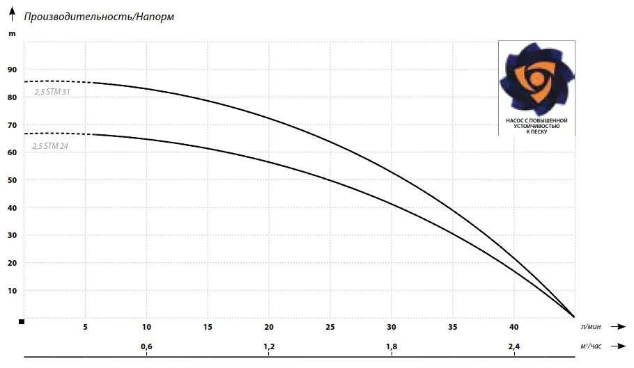 Многоступенчатые скважинный насосы диаметром 66 мм с повышенной устойчивостью к песку, рассчитанные на 3 и 4–дюймовые скважины. Насос IBO 2,5STM 24 кабель 20 метров обладает повышенной эффективностью к содержанию песка в перекачиваемой жидкости. Устойчивость к песку был достигнут благодаря использованию «плавающих лопастных колес» и выбору износостойких материалов. Скважинный насос IBO 2,5STM 24 кабель 20 метров обладает отменными характеристиками для насоса с небольшим диаметром. Максимальный напор насоса ИБО составляет 66 м, при этом максимальная производительность в пиковой точки показывает 2.7 м³/час. При таких напорно-расходных характеристиках мощность двигателя составляет всего 370 Вт. Конденсатор насоса встроен в двигатель, благодаря чему электрическая установка намного проще, чем в случае насосов со стартовой коробкой. Насос оснащен тепловой защитой, установленной в обмотке двигателя. Насос комплектуется кабелем 20 м. Основным преимуществом насоса IBO 2,5STM 24 кабель 20 метров является чрезвычайно высокая производительность для насоса диаметром 66 мм со скоростью до 2.7 м³/час.
