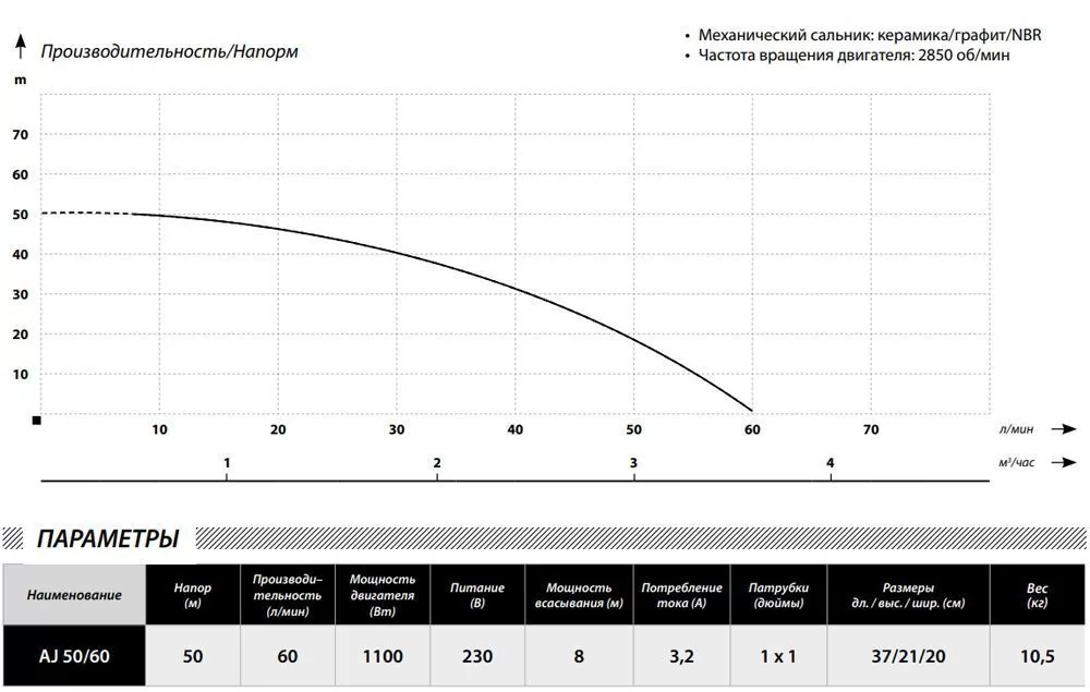 Насосная станция IBO AJ 50/60 24л+защита по сух,ходу оснащена системой увеличивающей мощность всасывания благодаря использованию трубки Вентури, благодаря данной системе насос способен поднять воду с глубины до 8 метров. Корпус насоса и вал в части, контактирующей с водой, выполнены из нержавеющей стали (версия INOX). Насосная станция имеет производительность в 3.6 м³/час, данной производительности будет достаточно чтобы организовать односемейного дома. За давление воды из крана отвечает напорная характеристика, максимальный напор в насосной станции IBO AJ 50/60 24л+защита по сух,ходу достигает 50 м. Насосная станция состоит из поверхностного самовсасывающего насос, системы автоматики на базе реле давления и манометра, гидроаккумулятора объемом 24 л. Насос имеет шнур питания с вилкой 0.5 м. Двигатель насоса оснащен тепловой защитой и имеет мощность в 1100 Вт.