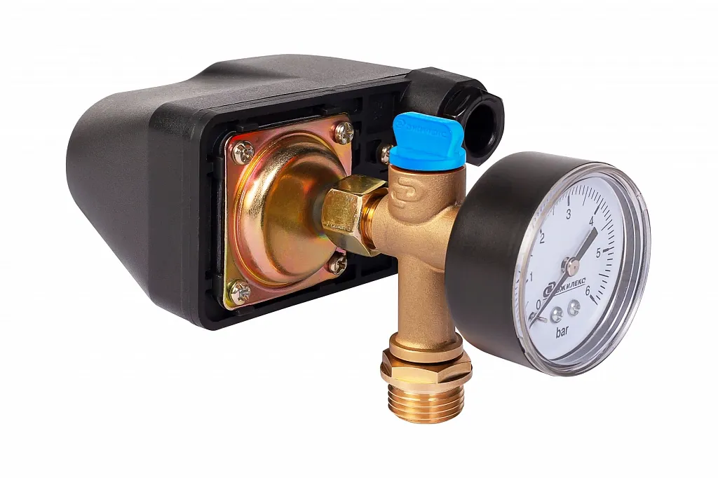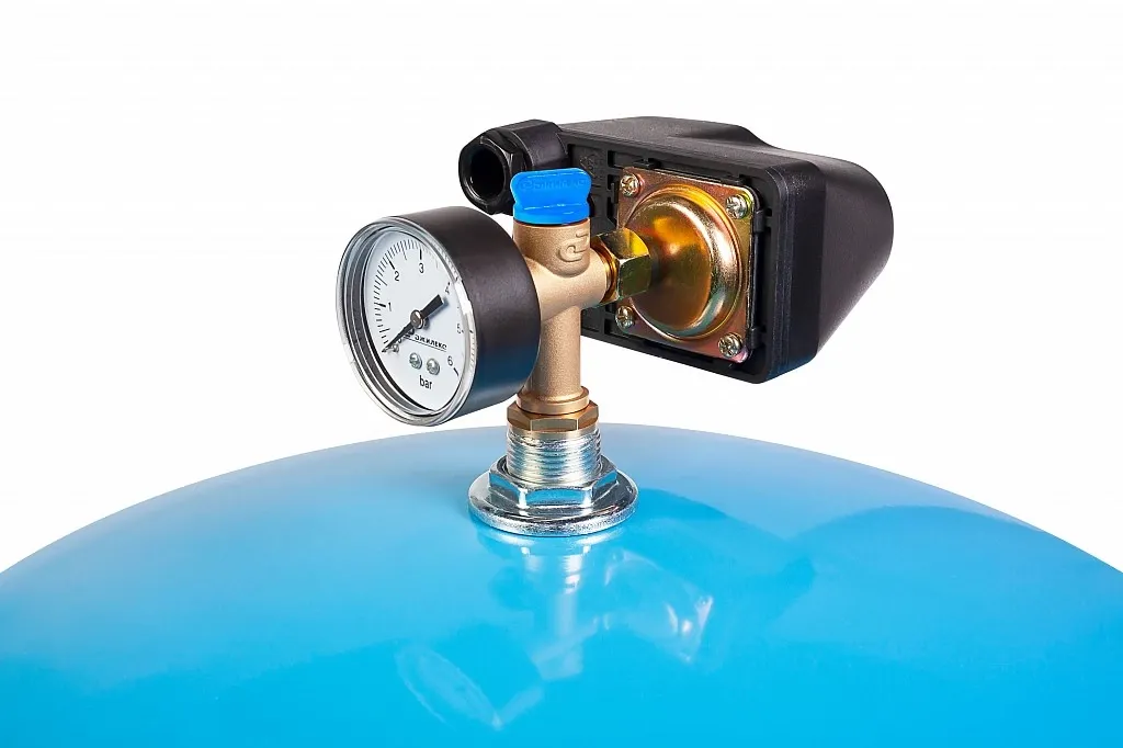 Визуальный контроль давления в системе водоснабжения позволяет осуществлять манометр с пределом измерения 6 бар.