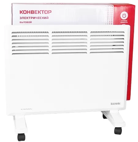 Внутри корпуса в нижней части расположен Х - образный алюминиевый радиатор, внутри которого установлен нагревательный элемент (ТЭН). ТЭН имеет 2 режима мощности нагрева в зависимости от модели конвектора. Изменение мощности нагрева производится путем включения кнопок. Возможно включение как только первой кнопки, так и только второй кнопки, а при включении обеих кнопок мощность нагрева суммируется. В каждую из кнопок встроен индикатор работы (светодиод) нагревательного элемента. Регулировка температуры нагрева производится путем поворота ручки регулировки температуры. Конвектор электрический ТЕПЛОКС укомплектован колесами роликового типа для передвижения по полу в помещении и креплением для подвешивания на стену.