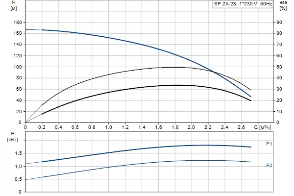 Насос Grundfos SP 2A-28 создан с применением новейших гидравлических технологий. Grundfos SP 2A-28 созданные специально для того, чтобы обеспечивать максимальную эффективность в периоды высокой нагрузки, насос имеет низкую стоимость и высокую надёжность эксплуатации вне зависимости от вида назначения. Grundfos SP 2A-28 обеспечивает высокую эффективность, высокое сопротивление абразивному износу (песку и иным абразивам), защиту от перегрева двигателя и простоту технического обслуживания. Также доступна готовая к применению система контроля и управления, предназначенная для постоянной оптимизации работы насосной системы. Максимальная производительность насоса 2.6 м3/час, максимальный напор 168 м при мощности электродвигателя 1500 Вт. Насос работает от сети 220 в. Гарантийный срок на насос Grundfos SP 2A-28 составляет 2 года.