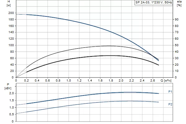 Насос Grundfos SP 2A-33 создан с применением новейших гидравлических технологий. Grundfos SP 2A-33 созданные специально для того, чтобы обеспечивать максимальную эффективность в периоды высокой нагрузки, насос имеет низкую стоимость и высокую надёжность эксплуатации вне зависимости от вида назначения. Grundfos SP 2A-33 обеспечивает высокую эффективность, высокое сопротивление абразивному износу (песку и иным абразивам), защиту от перегрева двигателя и простоту технического обслуживания. Также доступна готовая к применению система контроля и управления, предназначенная для постоянной оптимизации работы насосной системы. Максимальная производительность насоса 2.5 м3/час, максимальный напор 195 м при мощности электродвигателя 1500 Вт. Насос работает от сети 220 в. Гарантийный срок на насос Grundfos SP 2A-33 составляет 2 года.